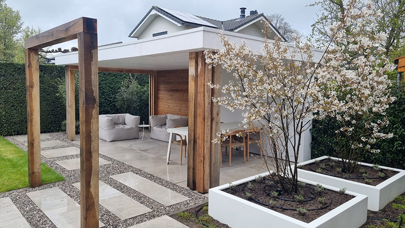Eikenhout staat bekend om zijn rustieke uitstraling die erg goed past in zowel een landelijke als moderne tuin. Maak uw veranda modern door eikenhout te combineren met mooie zwarte raampanelen. Eikenhout krijgt eerst zwarte strepen en vergrijst vervolgens prachtig!