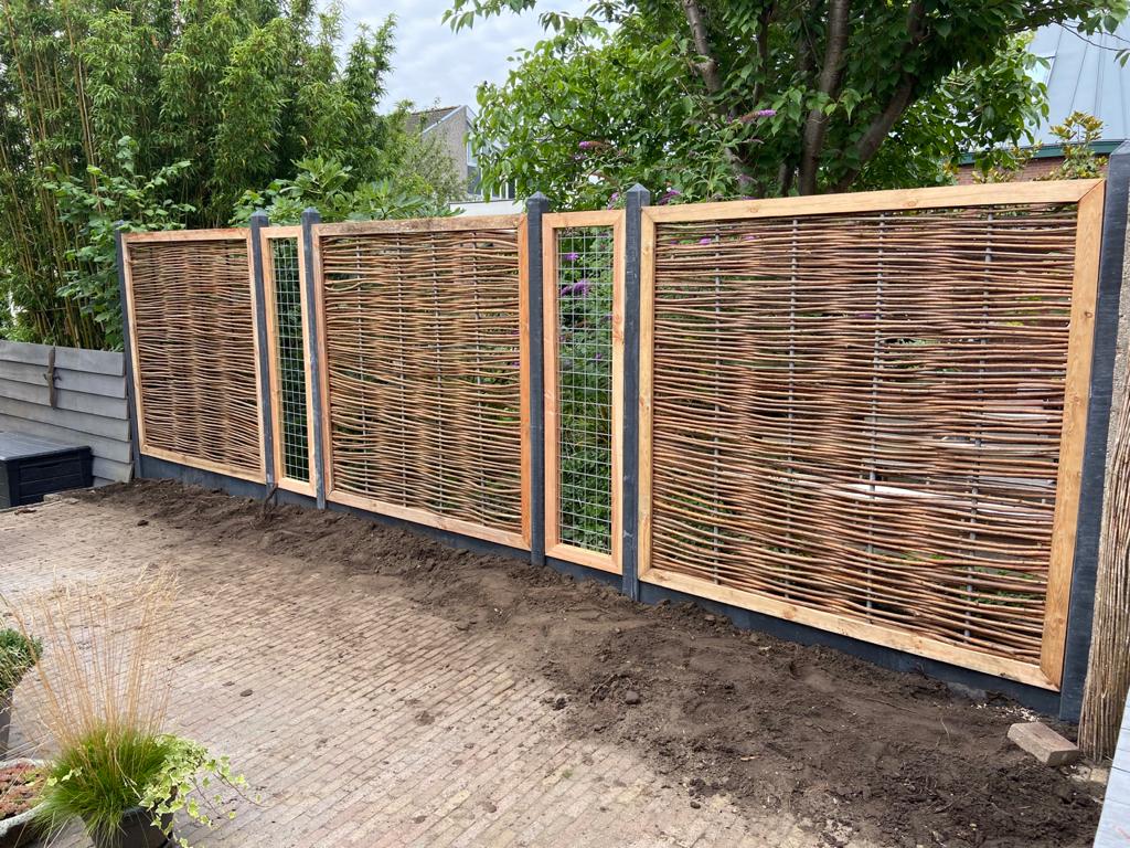 Draadschermen met houten kader worden vaak gebruikt als afwisseling tussen schuttingpanelen, vanwege hun open uitstraling. Ook is het leuk om er klimplanten tegen te laten groeien.