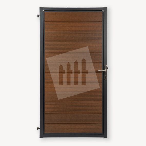 Kleur: teak brown met antraciet aluminium | Inclusief slot, hang- en sluitwerk | 190 cm hoog en 100 cm breed