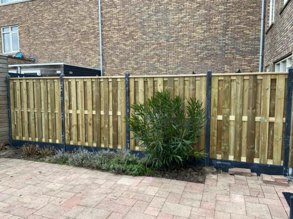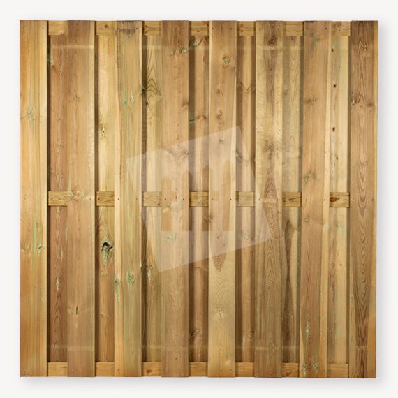 Het geïmpregneerd grenen tuinscherm Barneveld bestaat uit 15 schuttingplanken die verbonden zijn door middel van 3 liggers. De planken zijn ca. 14-14,5 cm breed, wat zorgt voor een gemiddelde doorkijk. Het scherm heeft een standaard afmeting van 180x180 cm (Hoogte x Breedte) en kan geplaatst worden in combinatie met houten palen en een betonband of betonpalen met een betonnen onderplaat.