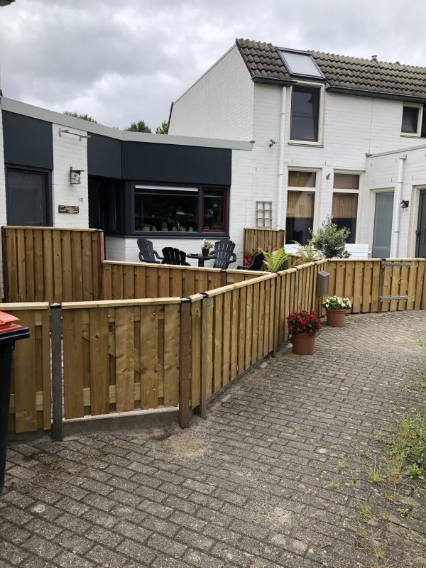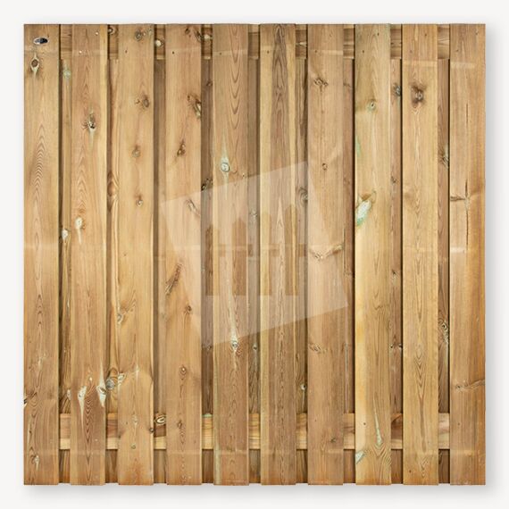 Het geïmpregneerd grenen tuinscherm Garderen bestaat uit 19 schuttingplanken die verbonden zijn door middel van 2 liggers. De planken zijn ca. 14-14,5 cm breed, wat ervoor zorgt dat het schuttingdeel weinig doorkijk biedt. Het schuttingpaneel is standaard 180 cm breed en beschikbaar in diverse hoogtes: 90, 130, 150 en 180 cm. Daarnaast is er een afbouwscherm beschikbaar dat in hoogte verloopt van 180 cm naar 90 cm hoog. Plaats het tuinscherm in combinatie met houten palen en een betonband of betonpalen met een betonnen onderplaat.
